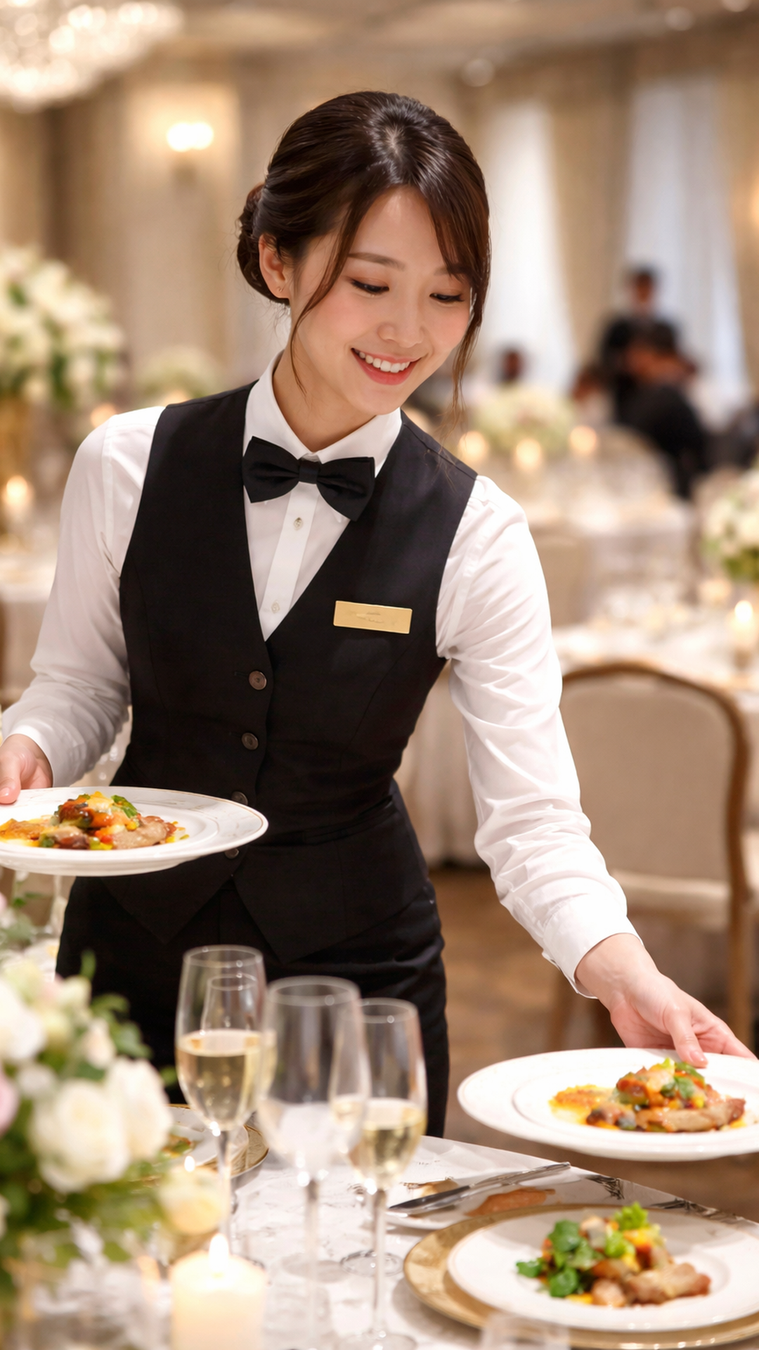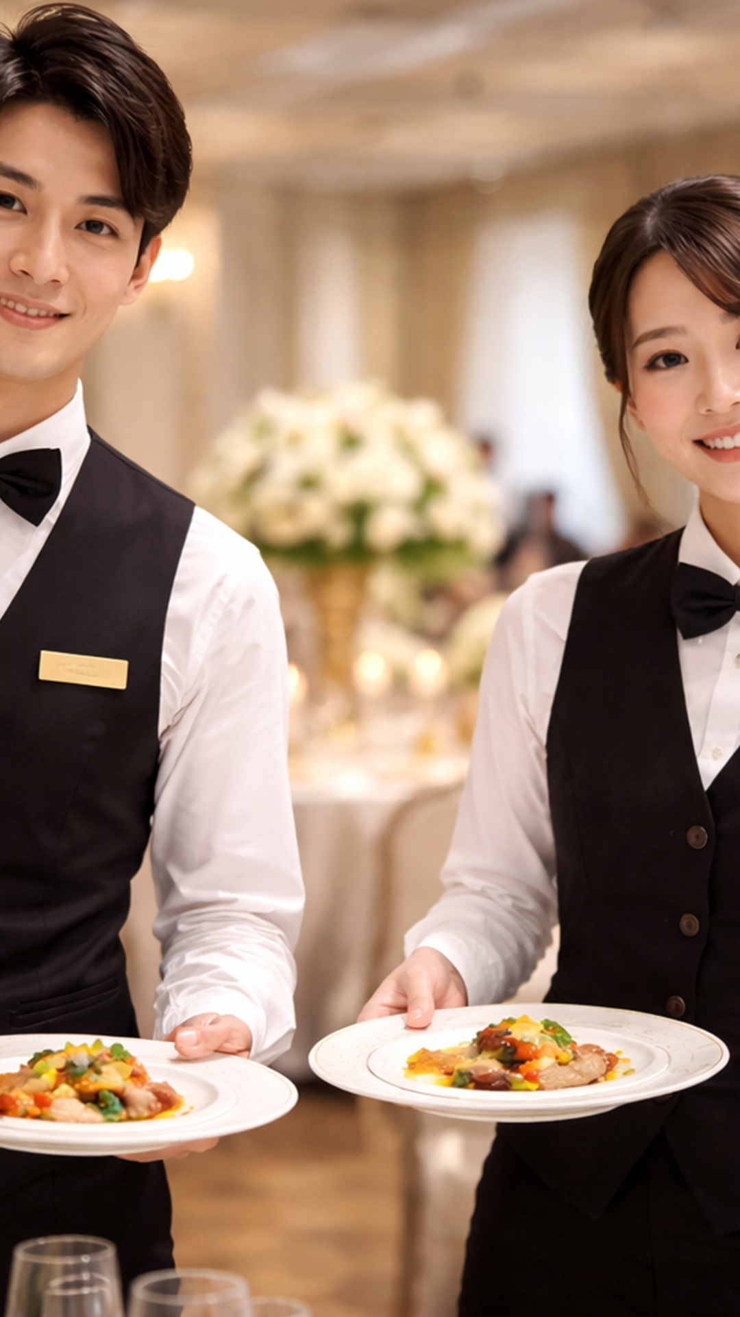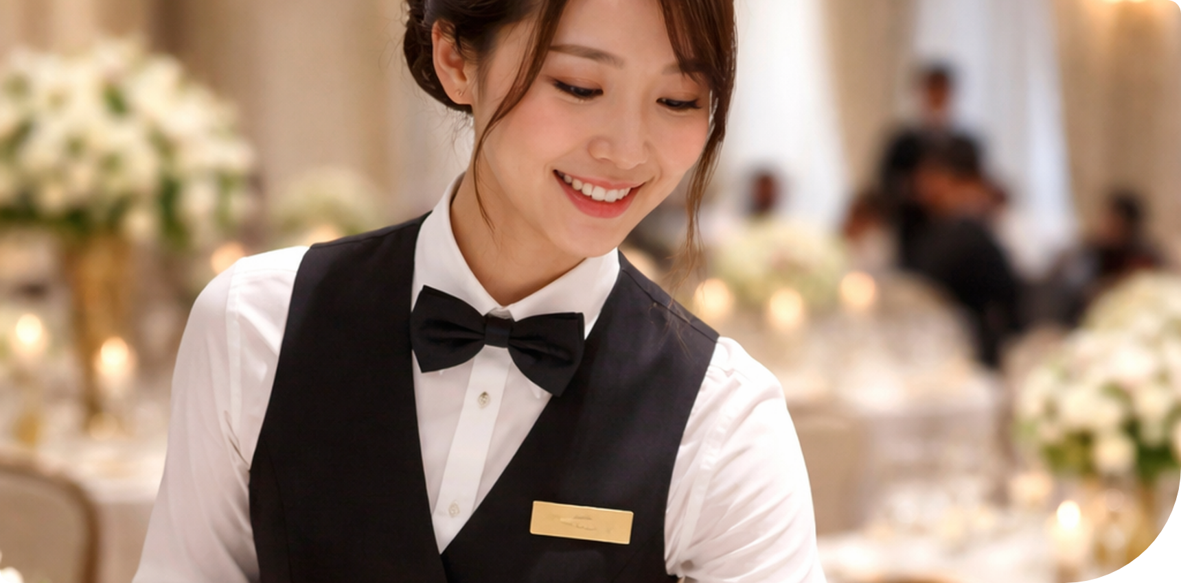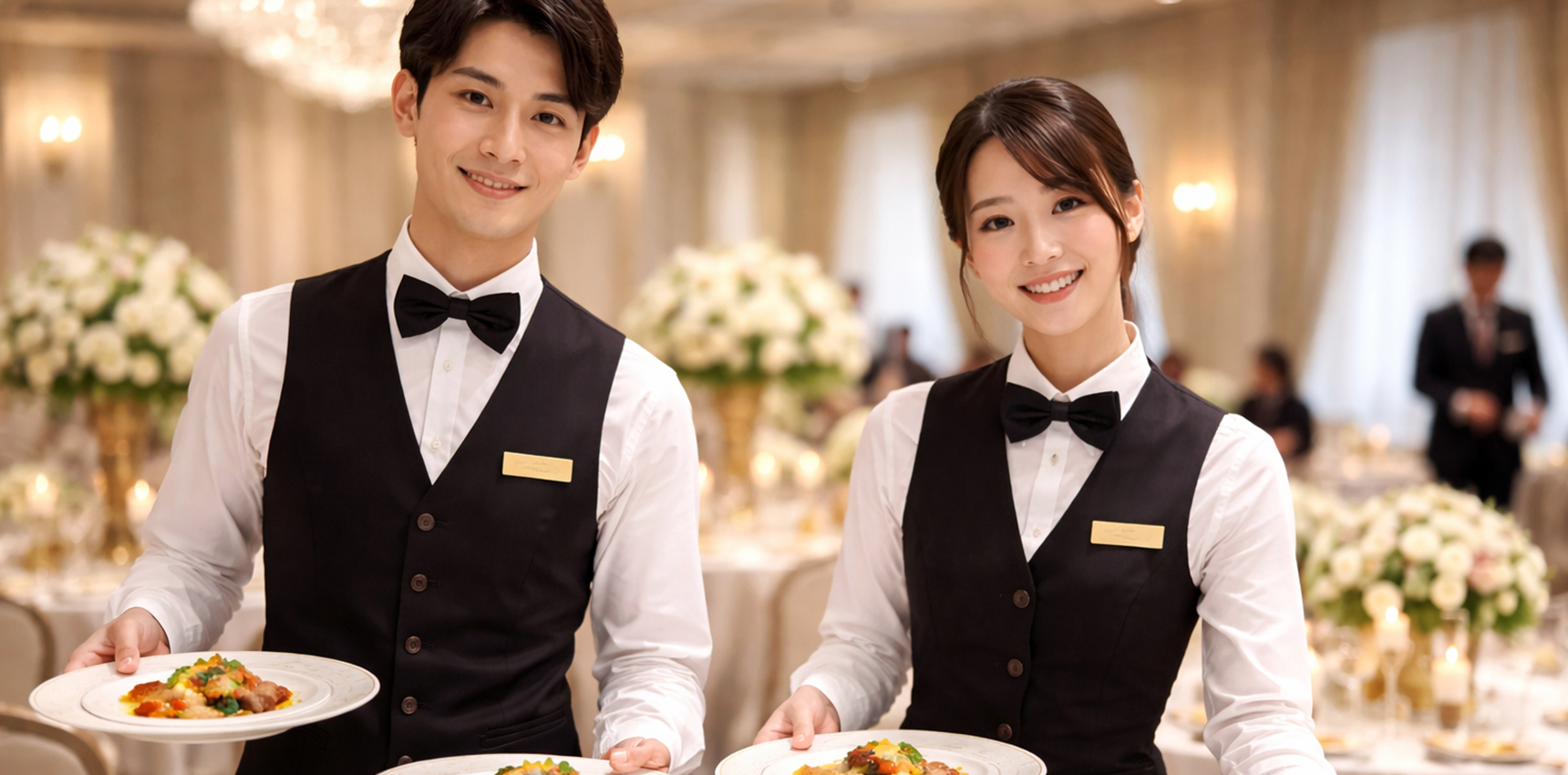 結婚式の披露宴やパーティー、ホテルレストランなどのホールサービスが中心です。配膳やお客様対応など、現場に応じた業務を担当していただきます。